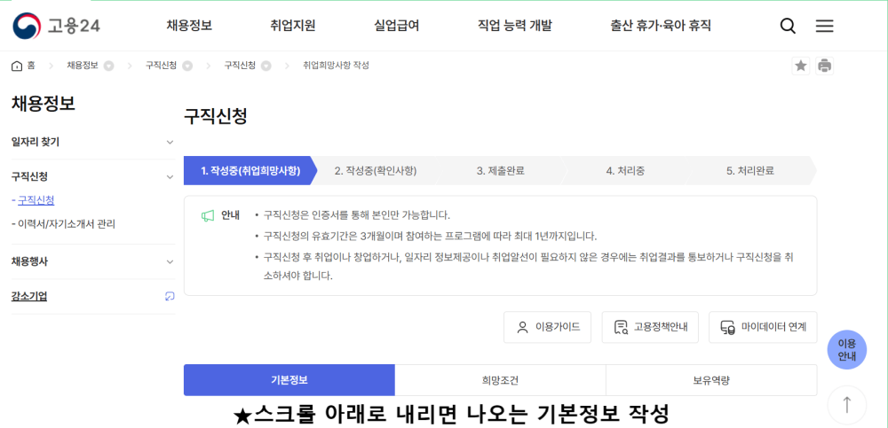 5. '구직신청' 스크롤을 아래로 내리면 나오는 기본정보(인적사항) 작성