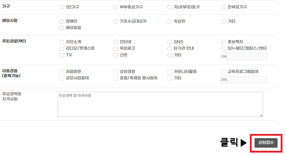 4. 페이지 제일 하단의 상담접수 클릭 → 상담접수 완료