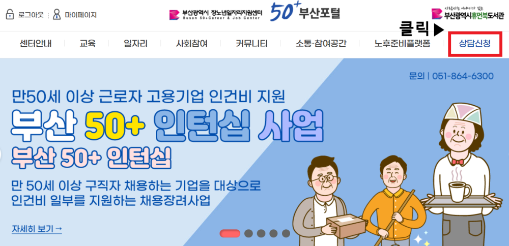 1. 50+부산포털 홈페이지 오른쪽 '상담신청' 메뉴 클릭